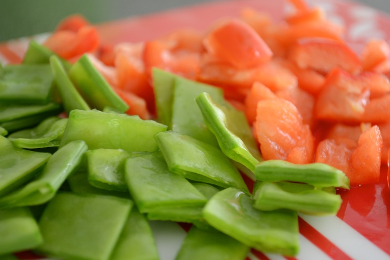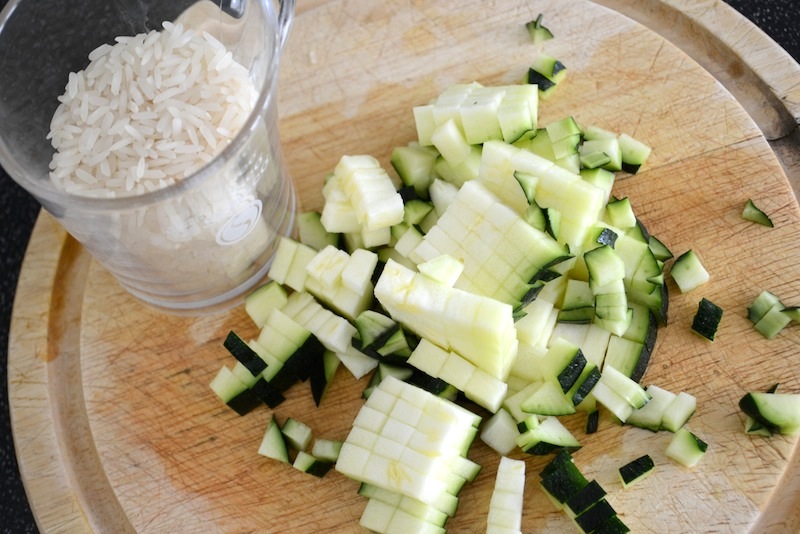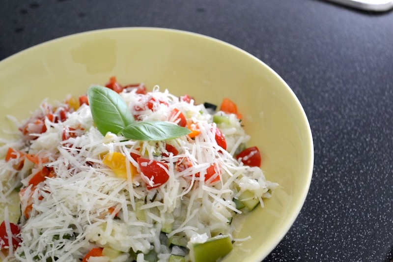 In der Zwischenzeit die frischen Zutaten (Zucchini, Paprika und Zuckerschoten) klein würfelig schneiden! Nach etwa 10-15 Minuten kann die Zucchini zum Reis gemischt werden. Nicht vergessen – das Risotto immer gut umrühren! Wenn der Reis bissfest ist (nach ca. 20-25 Min. Garzeit), können die Zuckerschoten und die Paprika untergemischt werden. Mit Salz & Pfeffer abschmecken! Bei geringer Hitze noch knappe 5 Min. ziehen lassen.