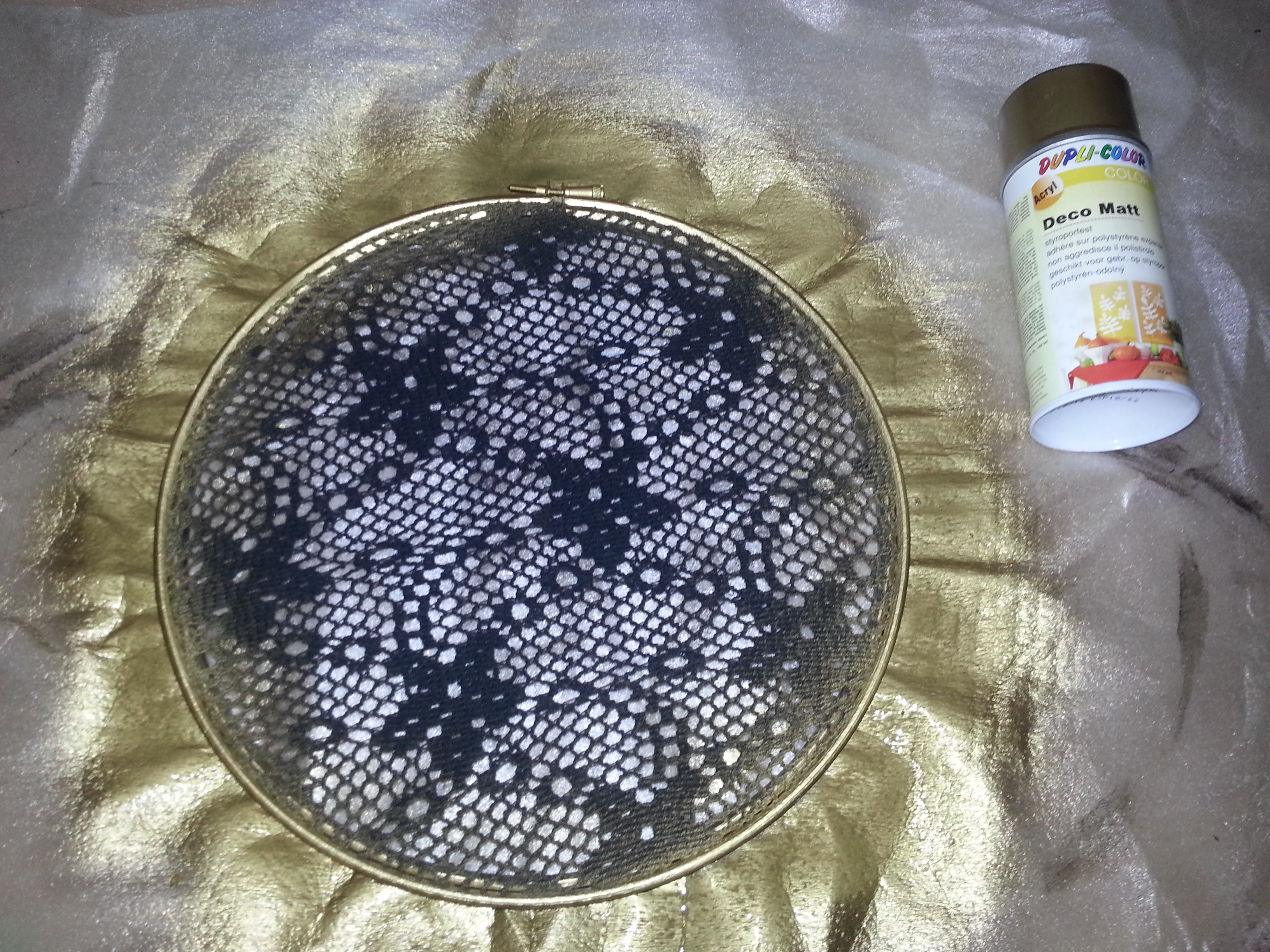 Einfach ein Stück Spitze möglichst straff in einen Stickrahmen spannen. Reste abschneiden und anschließend den Rahmen mit Acrylfarbe einsprühen. Trocknen lassen und ab an die Wand damit!