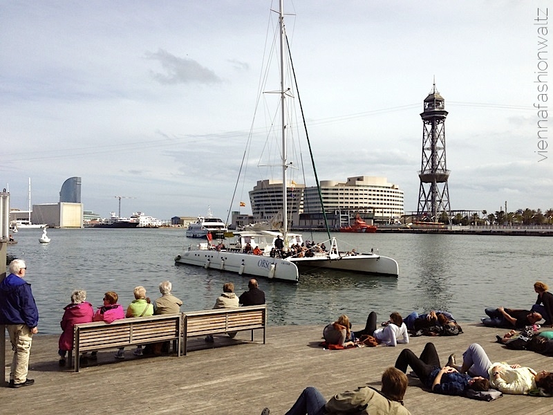 Gestärkt von deftigen Baked Beans, Salat mit Speck & pochiertem Ei, sowie Pancakes mit griechischem Joghurt machten wir uns wieder auf Erkundungstour. Sonntags ist das gar nicht so einfach, also schlenderten wir den Hafen entlang. Das schlechte Wetter zog heran, diesem wirkten wir im Einkaufszentrum Maremagnum entgegen. Rund um die Uhr geöffnet, auch Sonn- und Feiertags! Ein Imbiss zwischendurch darf nicht fehlen, da kam uns die Creperie richtig gelegen.