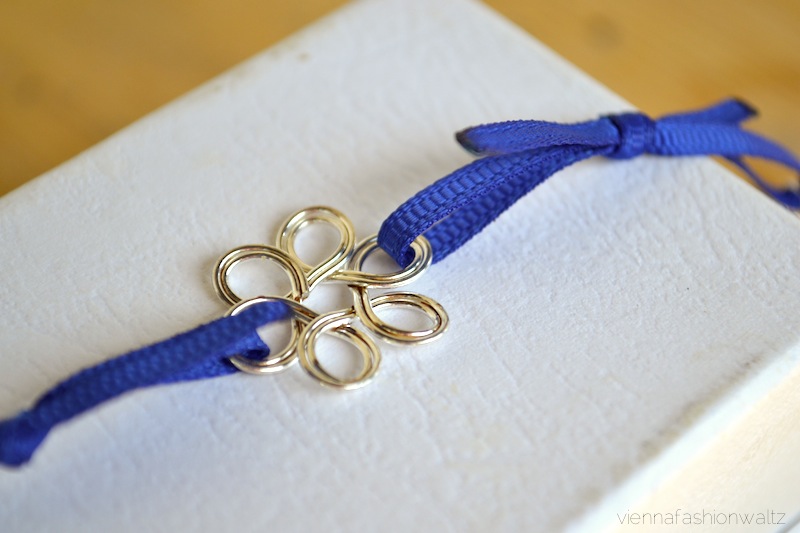 Zwei gleich lange Stoffbänder nehmen (Pi mal Daumen sollte die Länge ca. zwei mal rund ums Handgelenk gehen), nun eines davon durch die Metallblume ziehen, eine Seite sollte rund 2-3 cm und die andere Seite sollte natürlich etwas länger sein. Einen Knoten binden, damit die Bänder zusammenhalten, aber noch nicht ganz festziehen. Dann das längere Teil vom Band nehmen und durch den Verschluss ziehen, umbiegen und durch den noch nicht festgezogenen Knoten stecken. Jetzt gut fest ziehen – die Metallblume und der Verschluss sind bereits befestigt.