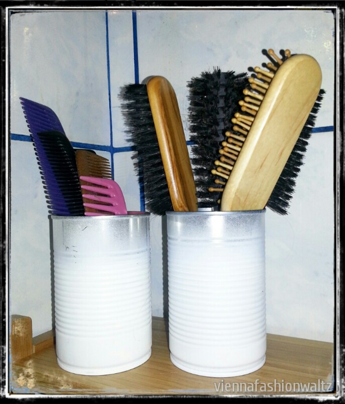 Diese kleinen Upcycling Dosen finden bei mir ihren Platz nicht nur am Schreibtisch sondern auch im Badezimmer und halten meine Haar- und Schminkutensilien griffbereit! Die Dosen eignen sich auch super als Zahnputzbecher.