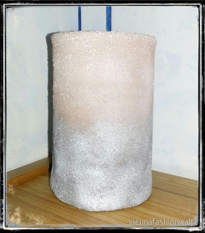 Eine andere Idee ist die Dose einfach mit Papier oder Stoff zu umkleben. Meine zweite Variante ist mit Stoff beklebt und zusätzlich mit silberner Farbe besprüht.