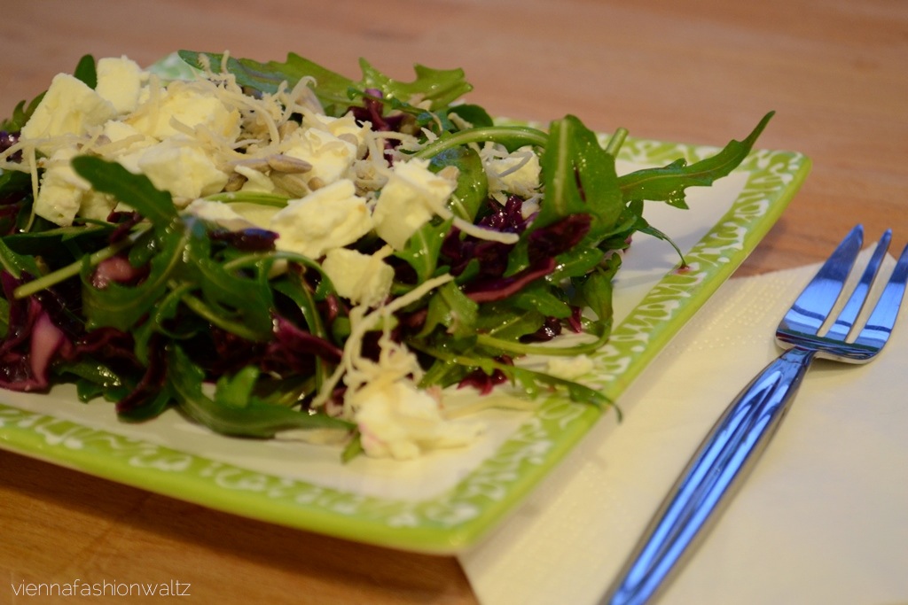 Das Rotkraut ganz fein schneiden – dazu eignet sich hervorragende eine Brotschneidemaschine – ich lasse es dazu im Ganzen, schneide lediglich den Strunk zuvor heraus. Abwaschen und im Sieb abtrocknen lassen – ebenfalls den Rucola waschen und abtropfen lassen. In eine große Salatschüssel geben und mit dem Dressing ab machen. Wer etwas Zeit hat, kann das Rotkraut zuerst marinieren und mit dem Dressing durchziehen lassen. Den Rucola dann erst kurz vor dem Servieren unterrühren.