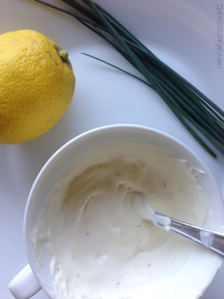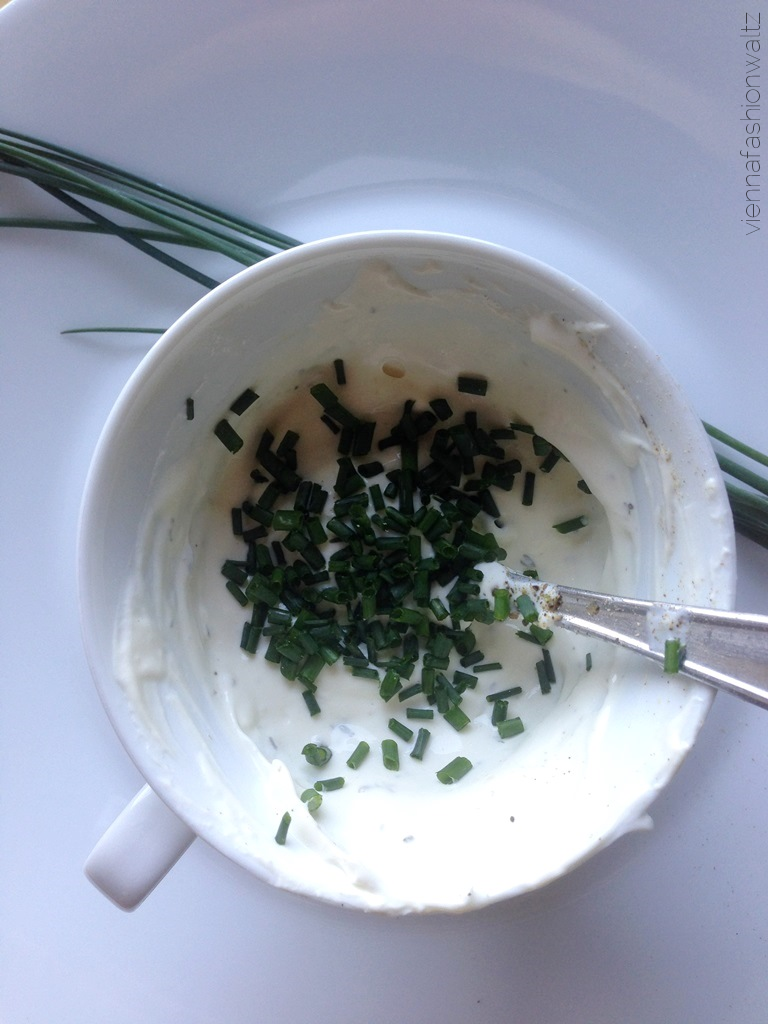 Je nach Geschmack und Vorliebe, kann eine Schnittlauchsoße (wie hier im Bild: Sauerrahm, Joghurt, Senf, Mayo, Knoblauch, Salz & Pfeffer, Zitrone, Schnittlauch), Jack-Daniels-Soße, Curry-Chutney & Co gereicht werden.