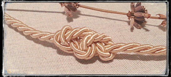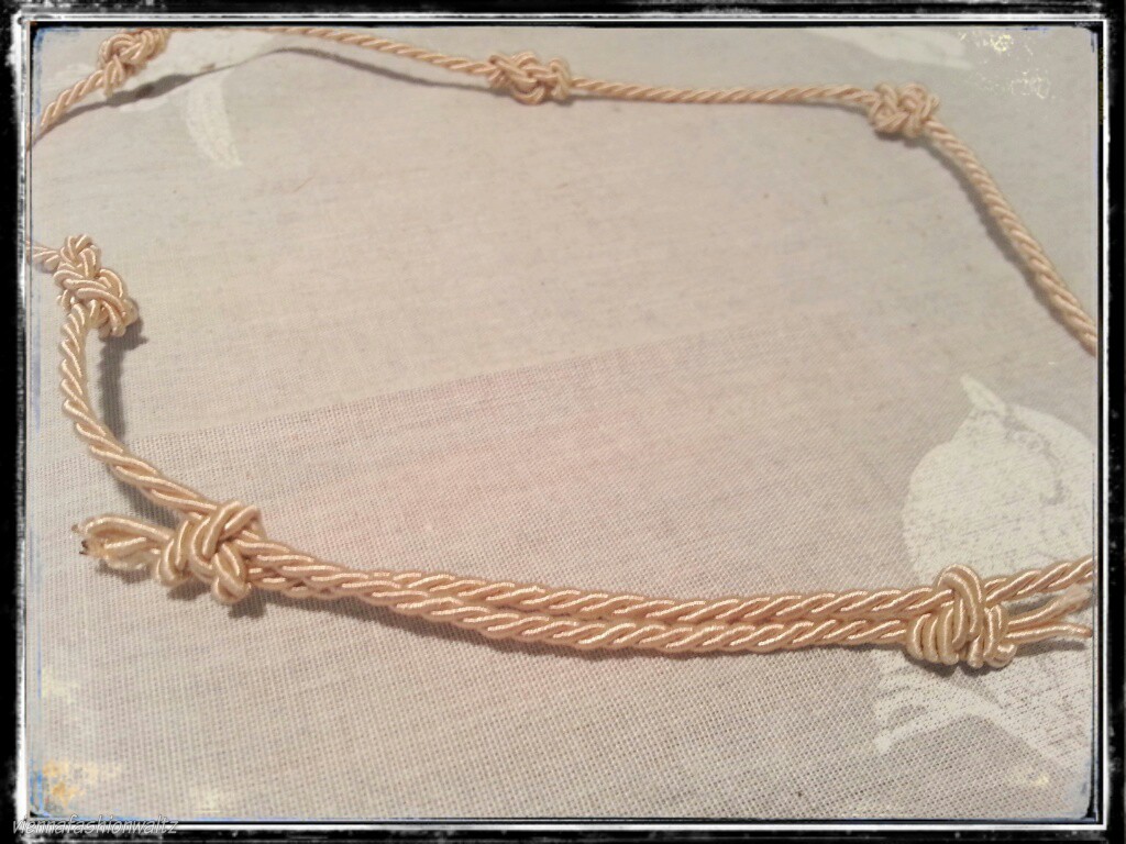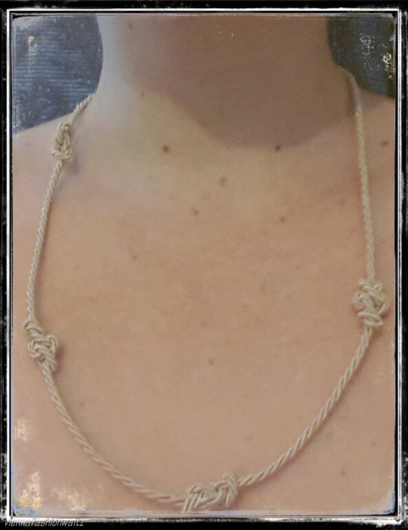 Ich habe nach dieser Anleitung (www.youtube.com/watch?v=VpeaJKTw620 ) mehrer Eternity Knots in eine Kordel geknotet. Die offenen Enden werden zu einem verschiebbaren Verschluß geknotet.