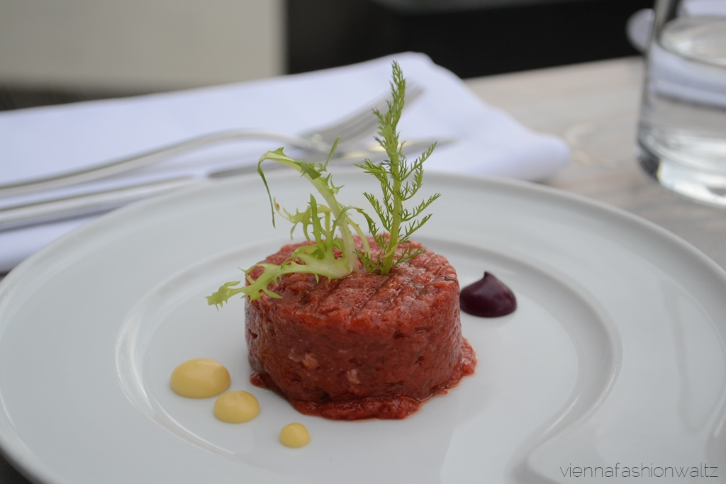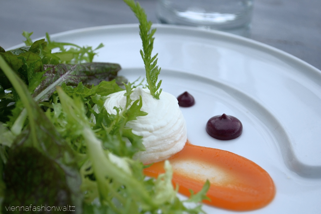 Wir haben uns dann aber doch für etwas essbares entschieden. Obwohl nicht auf der Barkarte aufgelistet, bekommt man auf Anfrage auch in der Bar das renommierte Beef Tartare des Hauses, das eines der besten in der Vienna City sein soll. Die Vegetarier unter uns wurden mit einem fluffig-leichten Ziegenkäse Espuma auf Kräutersalat verköstigt. Bei den lila Pünktchen im Bild handelt es sich übrigens um Senf mit Überraschungseffekt – darf ich hier das Wort Gaumenorgasmus erwähnen?