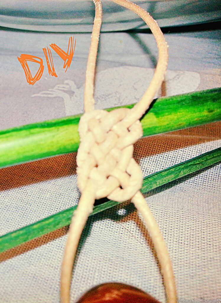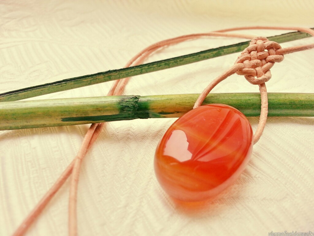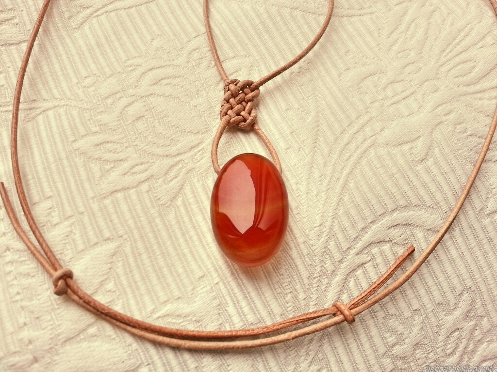 Diese hübsche Kette ist sehr schnell gemacht. Der Karneol wird auf ein Lederband gefädelt und mit einem Knoten verziert!
