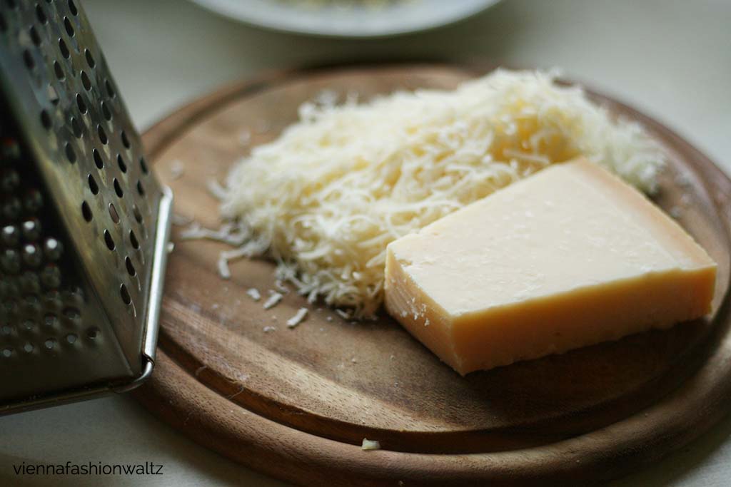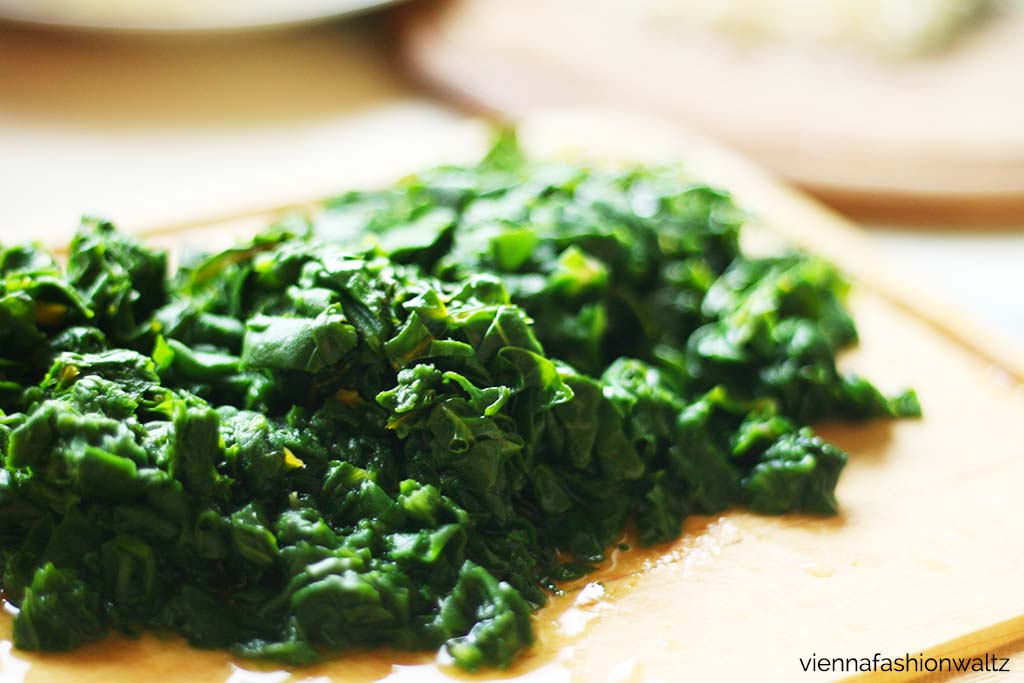 Zuerst werden die Spinatblätter entstielt und gewaschen. Danach in einem großen Topf Wasser aufkochen, salzen und den Spinat darin blanchieren. Den Spinat abseihen und mit Eiswasser abschrecken. Knoblauch und Spinat fein schneiden und den Parmesan reiben.