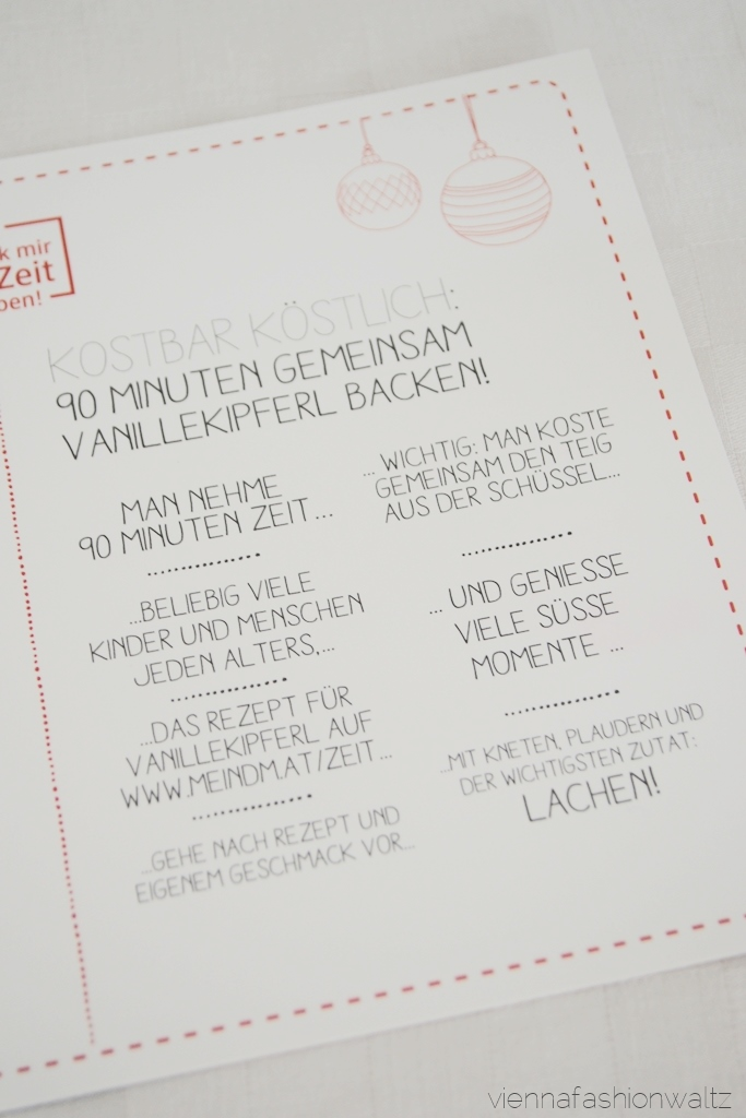 Ich schenk mir mehr Zeit fürs Leben, lautet das Motto der limitierten Themenbox von dm! Fünf verschiedene Boxen, in weihnachtlicher Umverpackung, standen zur Auswahl. Ich habe mich, der Jahreszeit passend, für die Backbox entschieden (Preis pro Box € 5,00 zzgl. Versandkosten). Und gebacken habe ich die Vanillekipferl nach Oma´s Rezept!