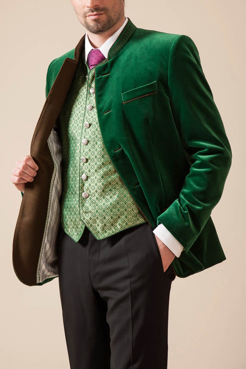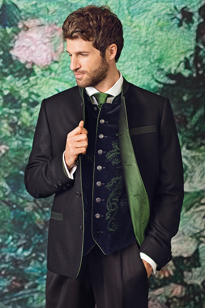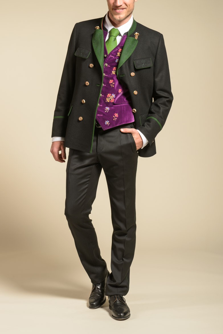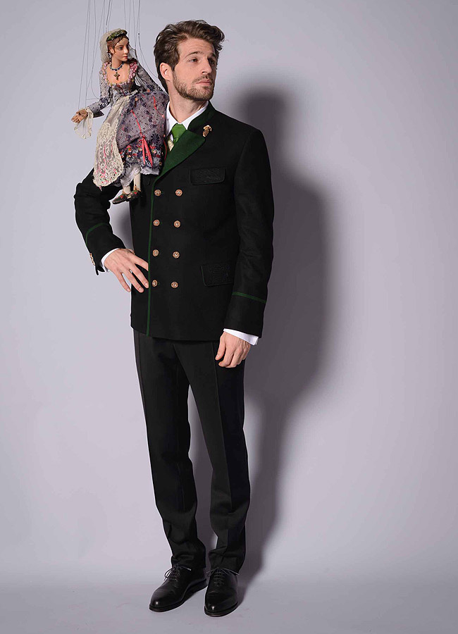 Jacke aus Kashmir Preis auf Anfrage // Jacke aus Ennstaler Loden Preis auf Anfrage // Joppe aus Baumwoll-Samt € 610,00 // Joppe aus steyrischem Loden € 770,00 // Anzug mit Seidengilet geschmückt mit 50-Groschen Knöpfen Preis auf Anfrage