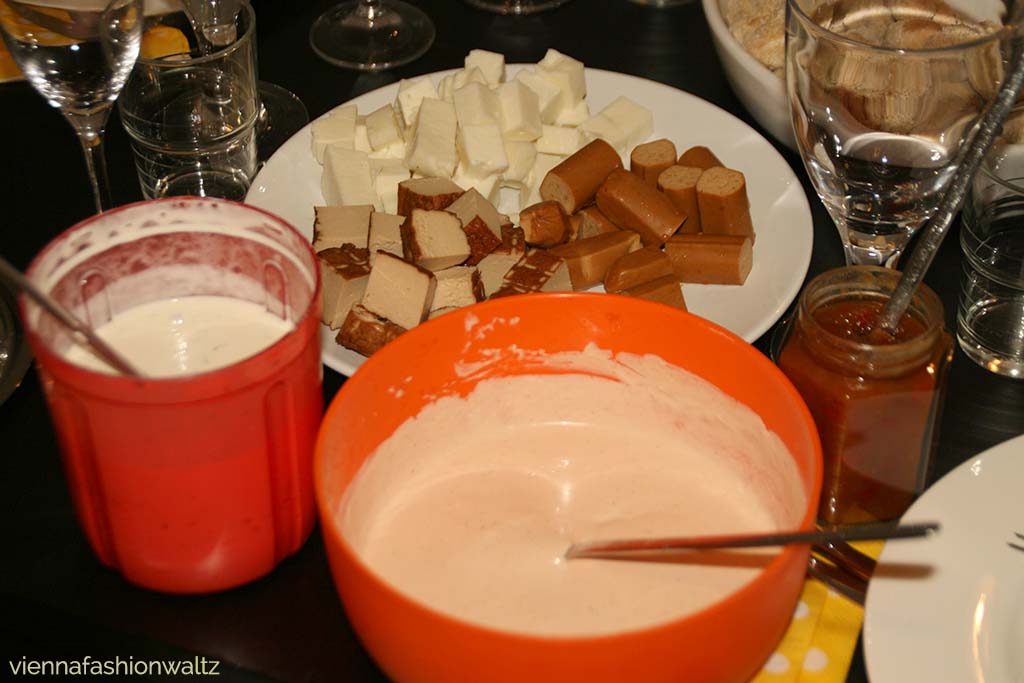 Eigentlich ist ein Fondue, das perfekte Essen für einen gemütlichen Abend, denn die Vorbereitung dauert nur ca. 1 Stunde und sobald die Töpfe auf dem Tisch stehen, kann sich auch der/die GastgeberIn gemtülich zum Tisch setzen und entspannen.