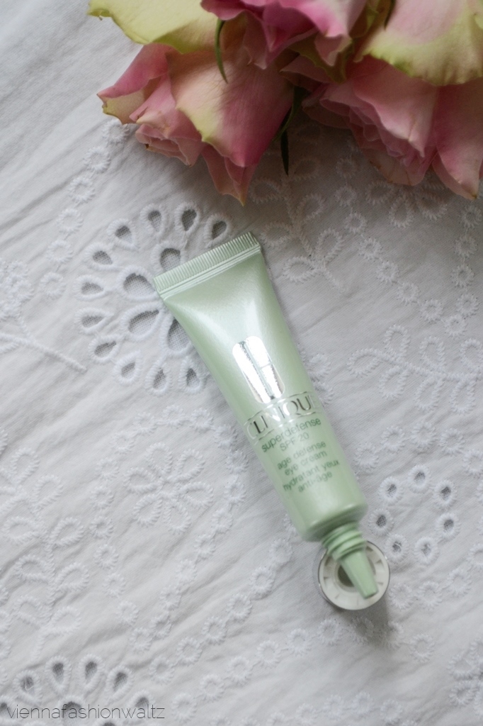 Seit einigen Monaten verwende ich tagtäglich die Augencreme von Clinique. Zwar hat mich im ersten Moment beim Kauf der Zusatz „Age Defense“ abgeschreckt, aber bei der netten Beratung habe ich den Kauf keine Minute bereut. Mit dem farblichen hellen Ton sorgt die Creme dafür, dass meine Augenringe zusätzlich zur Pflege und Feuchtigkeit noch aufgehellt werden und ich bekomme sofort ein strahlendes Gesicht. Zusätzlich bietet diese sanfte Augenpflege auch einen UV-Schutz SPF 20. Da ich wirklich besonders zufrieden damit bin, habe ich gleich für Nachschub gesorgt – am Flughafen lässt sich einfach besonders gut Shoppen. Allerdings ist mir heute bei meiner Recherche für diesen Blogbeitrag aufgefallen, dass die Augencreme anscheinend ein Facelift bekommen hat bzw. neu aufgelegt wurde und nun Superdefense Age Defense Eye Cream Broad Spectrum SPF 20 heißt (€ 39,90)!