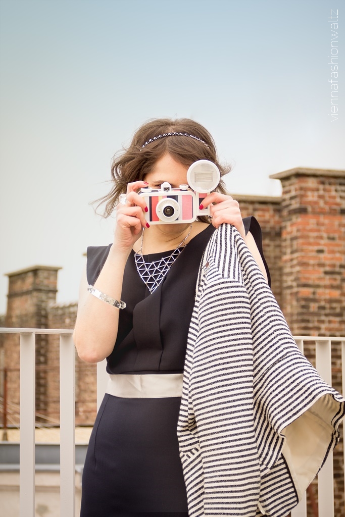 Kleid: Montego via Peek & Cloppenburg € 69,95//Schmuck: Pierre Lang € 199,00// Nagellack: Catherine erhältlich via schönsein // Netzstrumpfhose: Palmers € 12,90 // Schuhe: Unisa // Kamera: Lomography La Sardina € 59,00// Streifenblazer: H&M ähnlicher via Peek & Cloppenburg