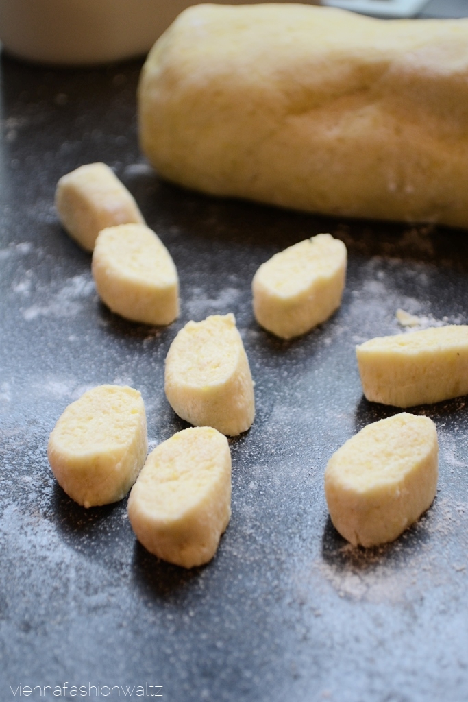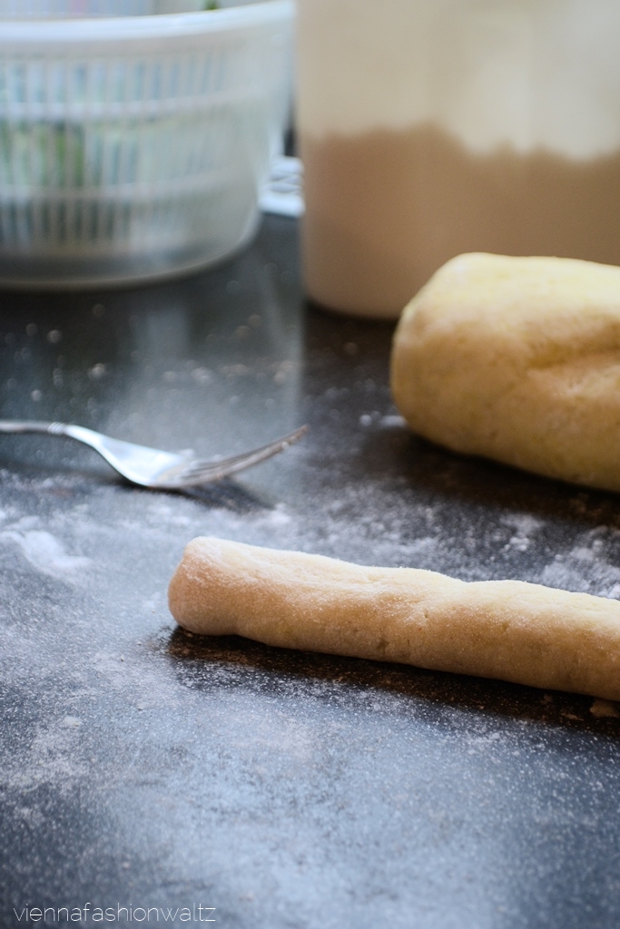 Danach den Teig in 6 Stücke teilen und daumendicke Rollen formen. Davon kleine Stücke abschneiden, dise entweder direkt ins leicht gesalzene Wasser geben, oder noch über eine Gabel rollen, damit die typischen Rillen entstehen für die Soße. Im siedenden Wasser leicht köcheln lassen, bis sie oben schwimmen, noch ein paar Minuten ziehen lassen, dann mit einer Schöpfkelle herausnehmen und in Butter schwenken.