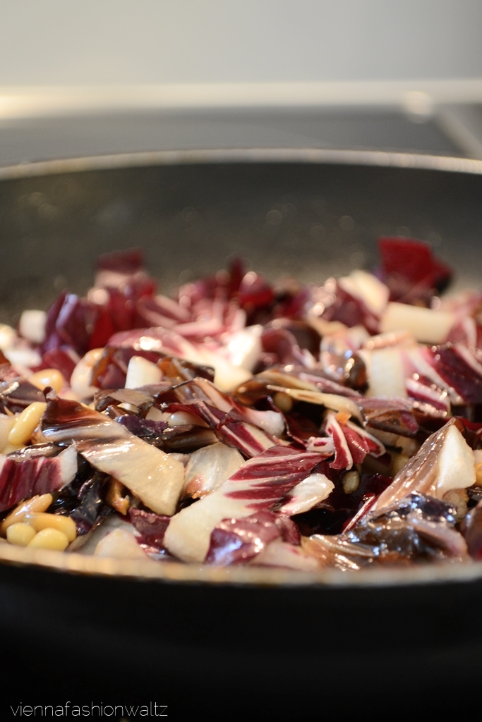 Den roten Chicorée waschen, bei großen Blättern den Strunck dreiecksförmig ausschneiden, halbieren und klein schneiden. Ebenso den Knoblauch schälen und klein würfelig schneiden. Im Olivenöl kurz rösten, die Pinienkerne dazu, mit einer Prise Zucker leicht karamelisieren und mit einem Schuß Balsamico ablöschen. Zum Schluss erst den roten Chicorée unterrühren, kurz dünsten und mit Salz & Pfeffer abschmecken.