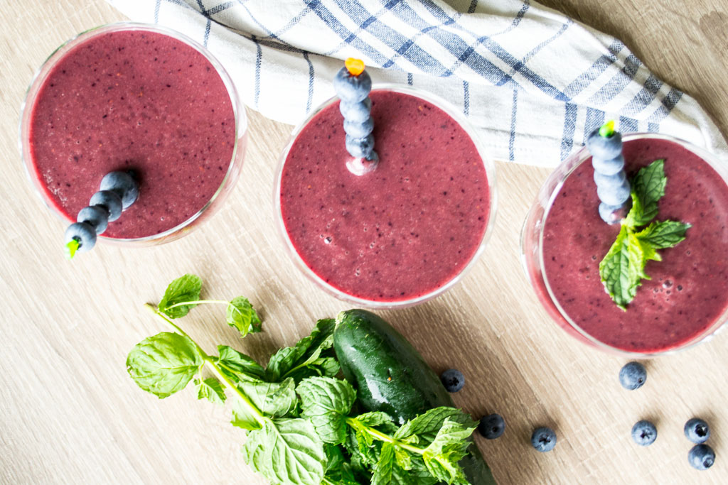 Die Bereen waschen und von etwaigen Stielen oder Grünzeug befreien. Die Gurke schälen und in kleinere Stücke zerteilen. Alles ab in den Mixer oder Smoothie Maker, mit der Flüssigkeit je nach Bedarf und Konsistenzwunsch aufgießen.