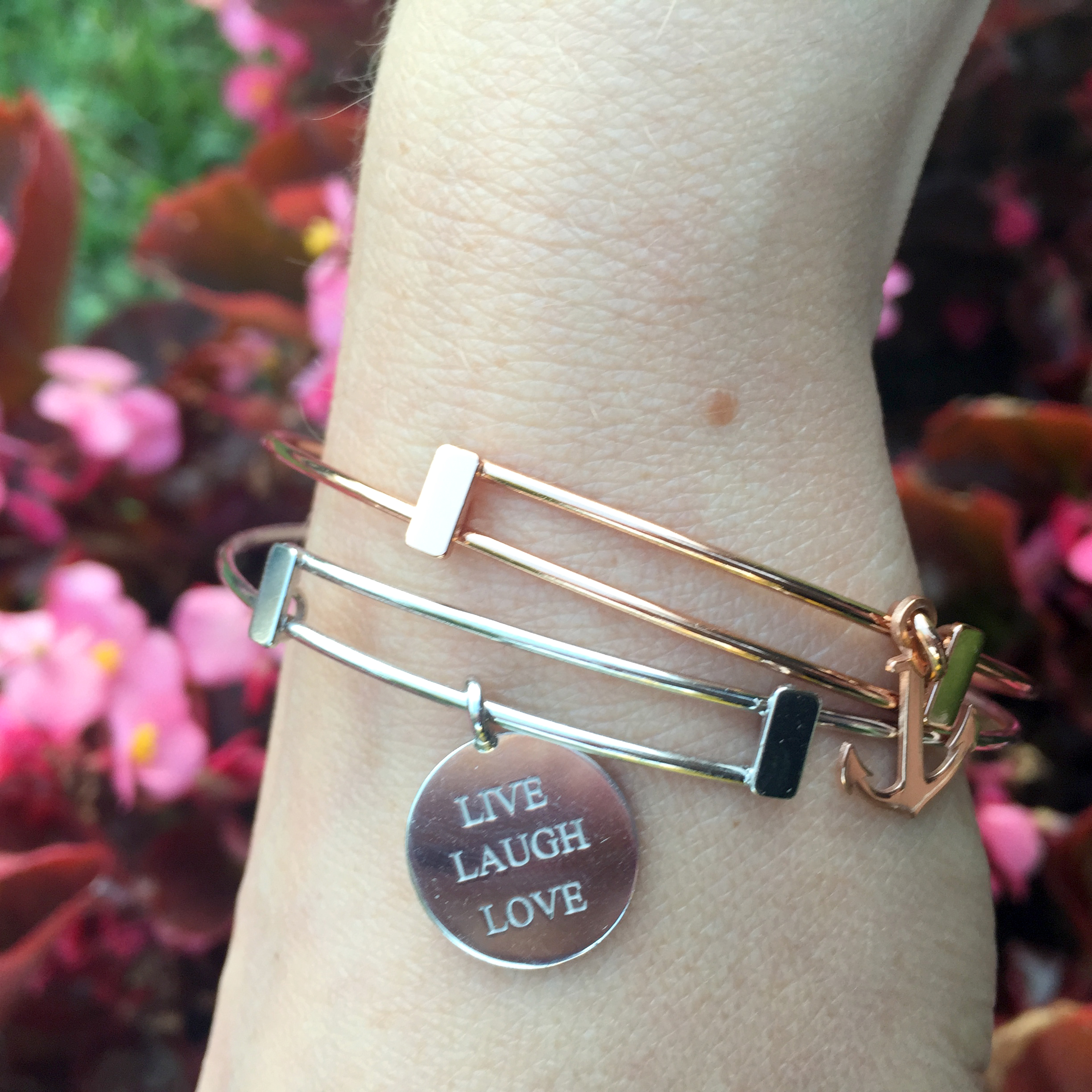 Ich trage immer zwei: einen rosefarbenen und einen silbernen. Die beiden Farben harmonieren einfach perfekt. Der Anker passt grossartig zu mir, für mich symbolisiert ein Anker – Boote, Meer und Urlaub. Wer mich kennt, weiß wie happy ich am Wasser bin! Der silberfarbene Bangle hat eine Message, die ein schönes Lebensmotto zum Besten gibt: Live Love Laugh.