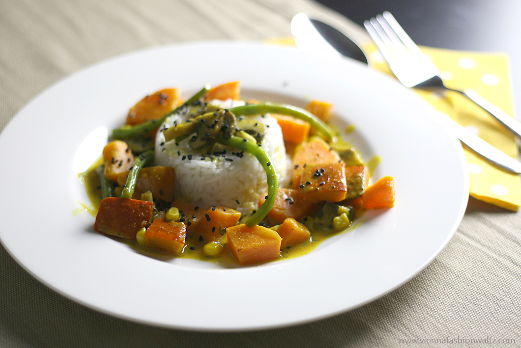 Zwiebel in Kokosfett anbraten, danach Curry und Kurkuma kurz mitanbraten mit 1/8 l Wasser ablöschen. Danach das ganze Gemüse bis auf die Zucchini in den Topf geben und mit der Kokosmilch aufgießen. 10 Minuten kochen lassen. Dann die Zucchini hinzufügen und nochmal 5-10 Minuten kochen lassen.