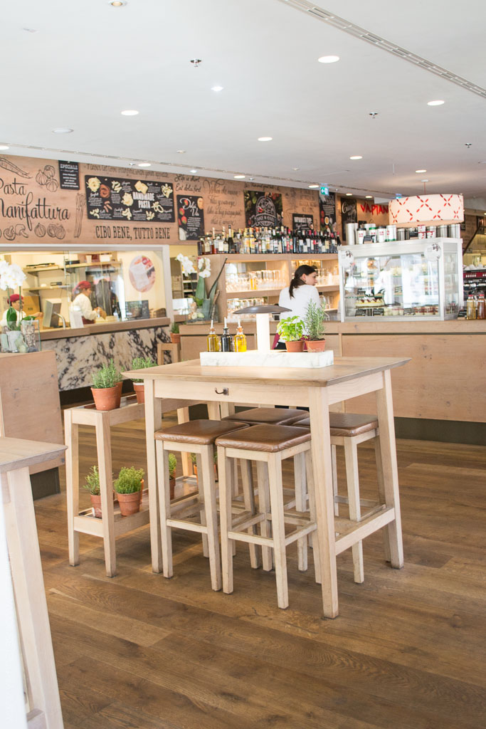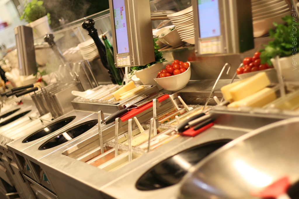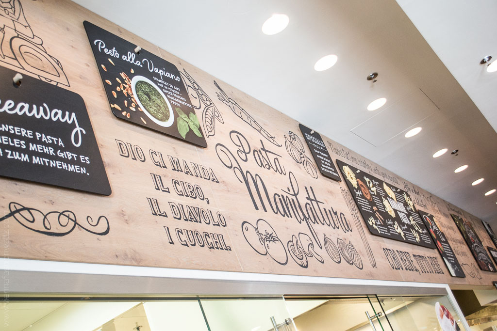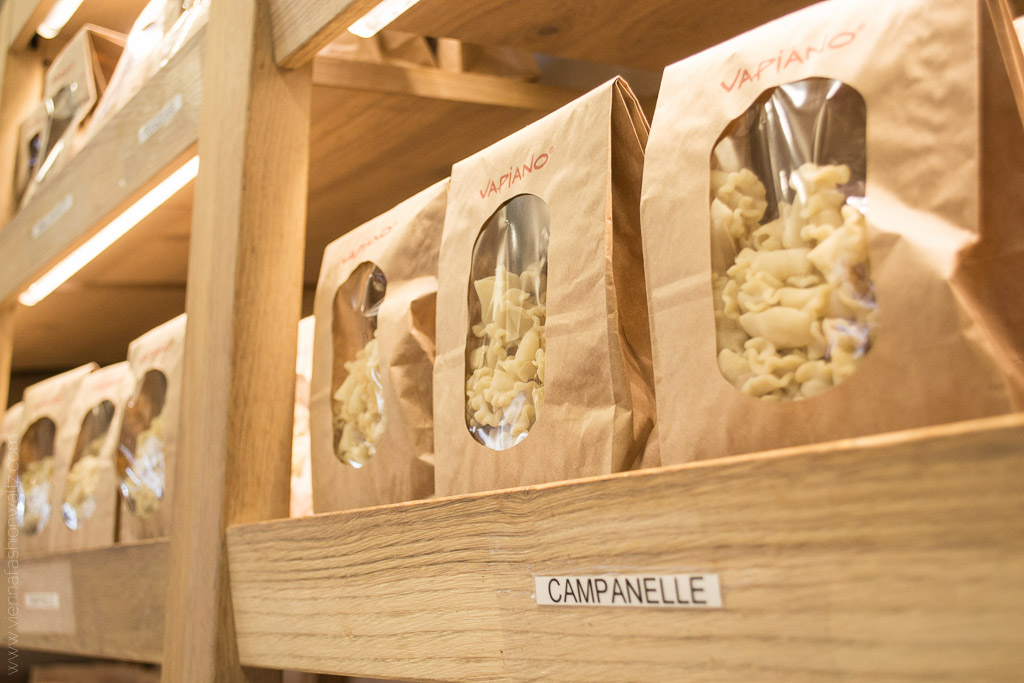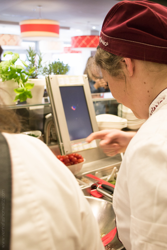 Wenn ihr euch auch schon gefragt habt, so wie wir, wie die Pasta in weniger als 2 Minuten fertig sein kann, dann dürfen wir dieses Geheimniss für euch lüften. Bei Vapiano wird das Gemüse & Co in der Früh frisch geliefert (Sonntag natürlich ausgenommen) und die Pasta wird keinesfalls geliefert, sondern ständig frisch in der hauseigenen Manifattura direkt vor Ort gemacht. Und da die Pasta nicht wie üblich getrocknet, sondern ratz fatz abgepackt und innerhalb von 6 Stunden weiter verarbeitet wird, sind sie auch ganz schnell al dente gekocht. Wenn ihr uns jetzt keinen Glauben schenken wollt, dann überzeugt euch selbst! Haltet einfach beim nächsten Vapiano-Besuch eure Augen offen und schaut bei der gläsernen Manifattura vorbei. Ich war bis dato wohl so von Hunger und Gusto abgelenkt, dass mir diese Station nicht aufgefallen ist.