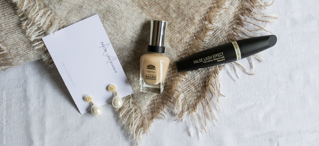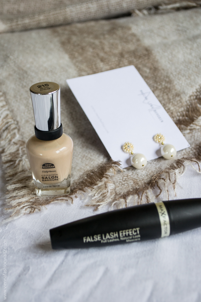 Das kleine Package, das wir für euch zusammen gestellt haben, besteht aus einem Schal/Foulard von Comma, Perlenohrringen von Maschalina Design, einer False Lash Effect Mascara von MaxFactor und einem farblich abgestimmten Nagellack in beige (Farbe 215 Shore Enough) von Sally Hansen.