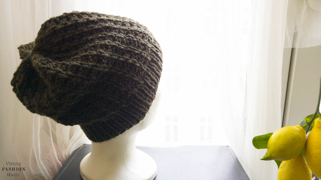 Dann im Muster weiterstricken. Nach 28 cm wird abgenommen. Für die Abnahme in den folgenden 2 R. je 2 M re. zusammenstricken. Den Faden durch die restlichen M. ziehen, zusammenziehen und Fäden vernähen.