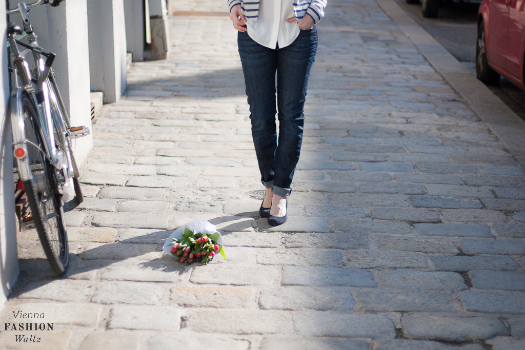 Striped Blazer/Cardigan: Esprit // Bluse: Esprit // Jeans: Bench (old, but gold – find similar here) // Heels: Vigneron (old, but gold – find similar here) //