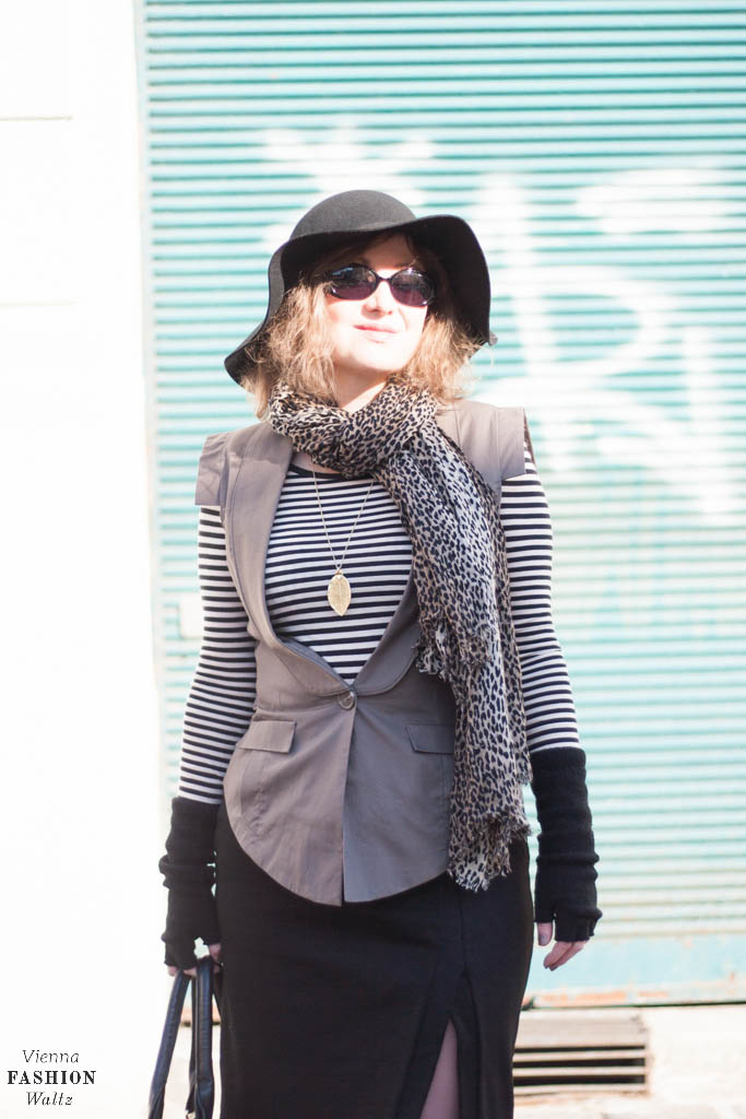Hut: Only // Brille: Armani // Striped Shirt: H&M // Schal: Mango // Kette mit Blatt: Freystil // Weste: Vila // Schuhe: Paul Green