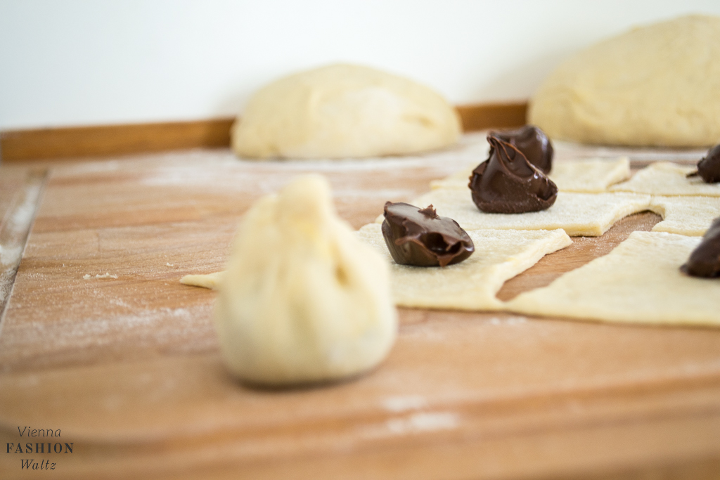 - Den Teig noch einmal niederschlagen und dann in circa drei gleich große Teile teilen. Einen nach dem anderen auf einer bemehlten Arbeitsfläche ausrollen und in kleine Vierecke schneiden. Einen Löffel Nutella drauf geben, alle Ecken zusammen nehmen und zu einem kleinen Päckchen formen. Eines nach dem anderen in eine bereits stark mit Butter ausgefettete Form geben.
