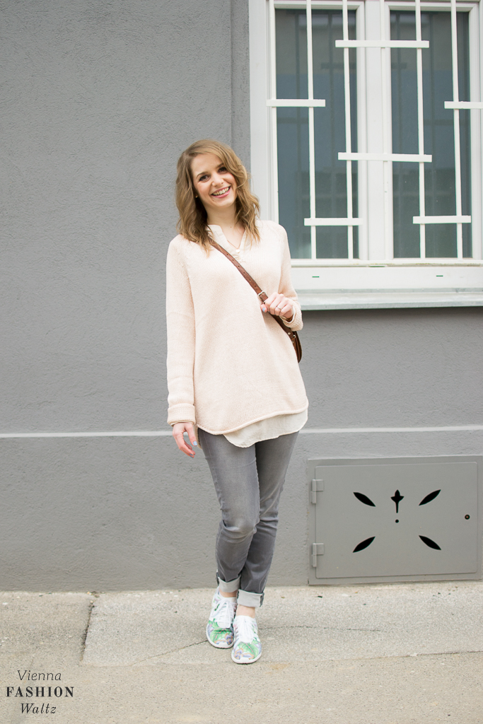 Pantone hat uns 2016 mit zwei spektakulären Farben beglückt – Rose Quartz und Serenity. Oder besser gesagt Himmelblau und Blassrosa! Als ich mir das Thema für ein Shooting überlegt habe, dachte ich zuerst, dass ich dazu nichts passendes hätte. Ein oder zwei Teile habe ich dann aber doch noch im Kleiderwahn, ahhhh im Kleiderschrank gefunden. Die Bluse hat mir meine Schwiegermama vor ein paar Jahren gekauft. Den Pulli für oben drüber habe ich mir dann doch noch bei H&M (aktuelle Kollektion) geholt und er ist ein super Teil für den Übergang – nicht zu dick und nicht zu dünn! Passend dazu meine Lieblingsjeans von TK Maxx (du findest sie auch schon in meinem Sale-Shopping-Beitrag hier). Und meine super frühlingshaften Sneakers von Adidas sind die perfekte Kombo und haben im Blumenprint gleich Rose Quartz und Serenity vereint.