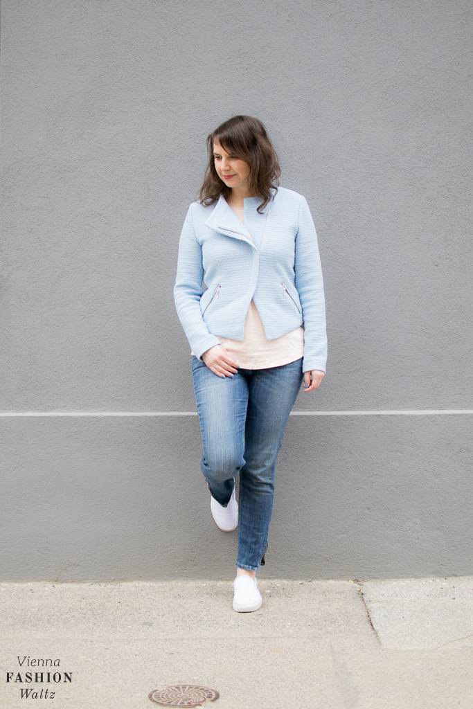 Jeans und ein simples rosa T-Shirt als Basisteil. Der Blazer in Serenity macht das Outfit sofort chic und die weissen Sneakers wieder lässig. Das perfekte Outfit um gut gelaunt ins Wochenende zu starten!