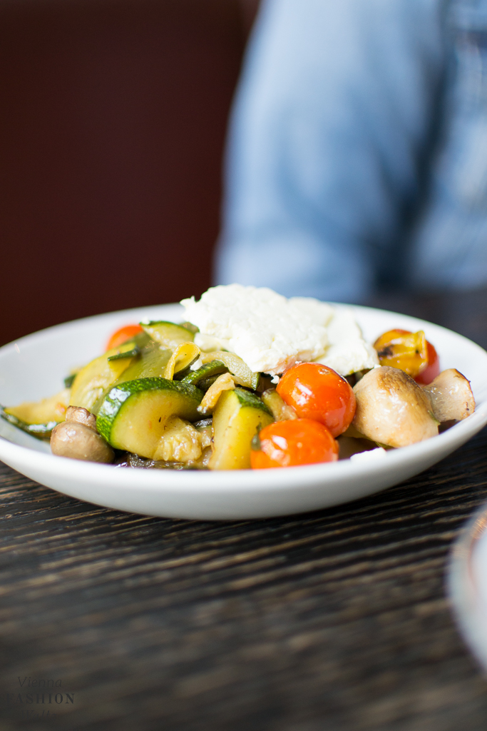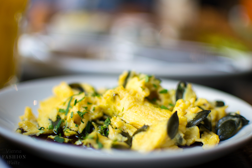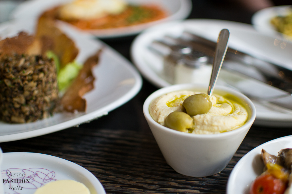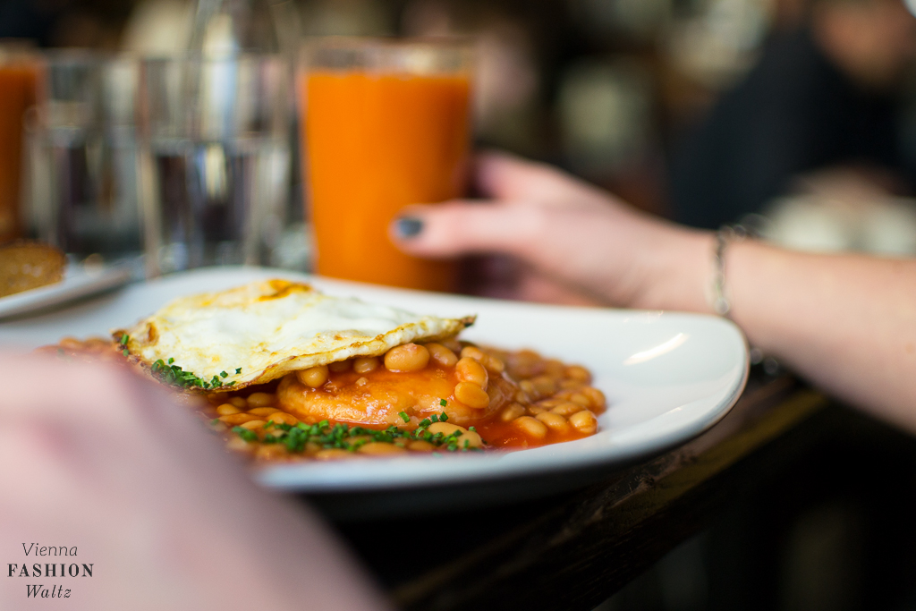 Das Aumann Frühstück beinhaltet ein Croissant, Butter, Marillenmarmelade, Gervais und einen Kuchen. Dazu haben wir noch ein paar der leckere Kleinigkeiten von der Karte gewählt. Diese haben sich allerdings als sehr große Portionen entpuppt und sind daher perfekt um sie gemeinsam zu teilen. Wir bestellten uns Hummus mit Oliven und Olivenöl, sowie den Antipasti-Teller, ein weiches Ei und zusätzlich noch die ausgesprochen leckere Eierspeise mit Kürbiskernen und Kernöl. Als Baked Beans Liebhaber sind wir auch nicht beim London Breakfast mit Bohnen, Spiegelei und Speck drum herum gekommen!