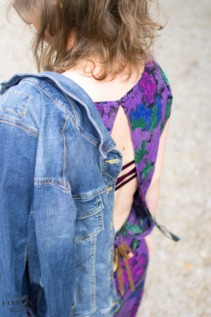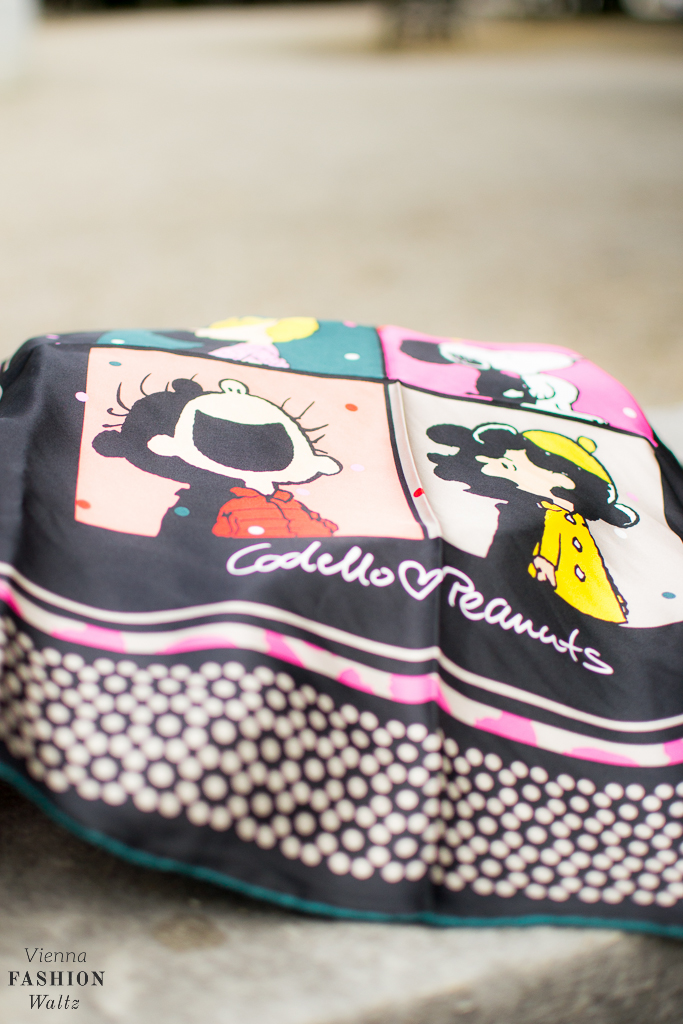 Seidentuch mit Peanuts-Print von Codello // Jeansjacke von C&A // Flower Power Kleid selbstgemacht // Tasche von &other strories // Ultra Boost Schuhe von Adidas