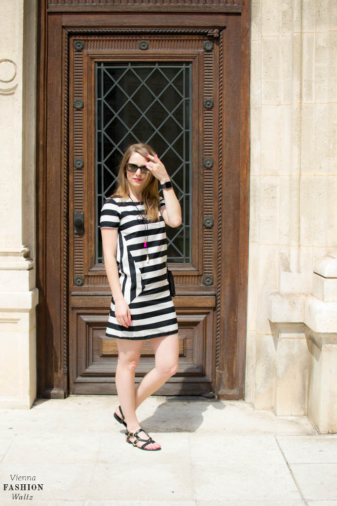 Das Kleid habe ich schon vor zwei Jahren sehr günstig bei Amazon ergattert und nach wie vor trage ich es sehr gerne. Stripes are a never ending story – was soll ich dazu bloß noch sagen! Dazu eine klassische Minibag in schwarz von Michael Kors (mal wieder ein Mitbringsel von einem Urlaub, oder besser gesagt, mein Mann hat das schöne Stück entdeckt und mir besondere Freude damit gemacht) und meine absoluten Sommerlieblinge – Sandalen mit goldenen Nieten von Kennel & Schmenger. Ohhh und siehe da, der Chocker macht sich auch gut als Accessoire am Fuß!