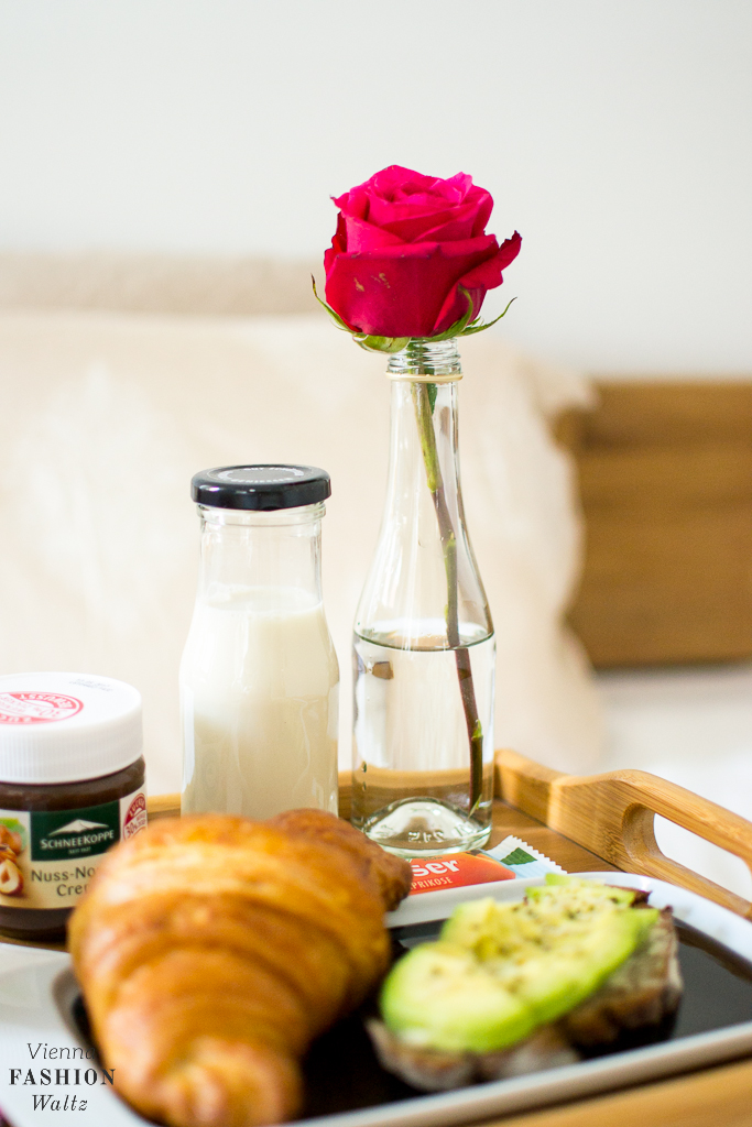 Am Sonntag schlafe ich gerne einmal länger, wenn ich ganz viel Glück habe, gibt es dann auch noch Frühstück im Bett und wenn mein Mann wieder bis tief in die Nacht gearbeitet hat, dann genieße halt einfach mein Frühstück alleine. Ich starte mit einem Glas Saft oder Wasser, dann muss es für mich unbedingt ein deftiges Brot mit Avocado geben und im besten Fall auch noch ein weiches Ei! Dann etwas Süßes, wie ein Croissant, Kipferl oder Semmerl mit selbstgemachter Marmelade (hier und hier). Statt zur Marmelade greift mein Mann lieber zu Nutella bzw. zur laktosefreien Variante von Schneekoppe ;-). Nebenbei wird vom Kaffee geschlürft, damit ich auch richtig munter werde – wobei meist trinke ich die Tasse erst ganz zum Schluss, wenn er schon kalt ist! Warum? Keine Ahnung! Damit dann auch noch etwas gesundes und vor allem ein wenig Obst bei meinem Frühstück vorkommt, gibt es auch noch eine kleine Schüssel Müsli. Den großen kunterbunten Müsli-Mix gibt es bei mir an Arbeitstagen, denn da habe ich – wie könnte es nicht anders sein – nicht so viel Zeit.