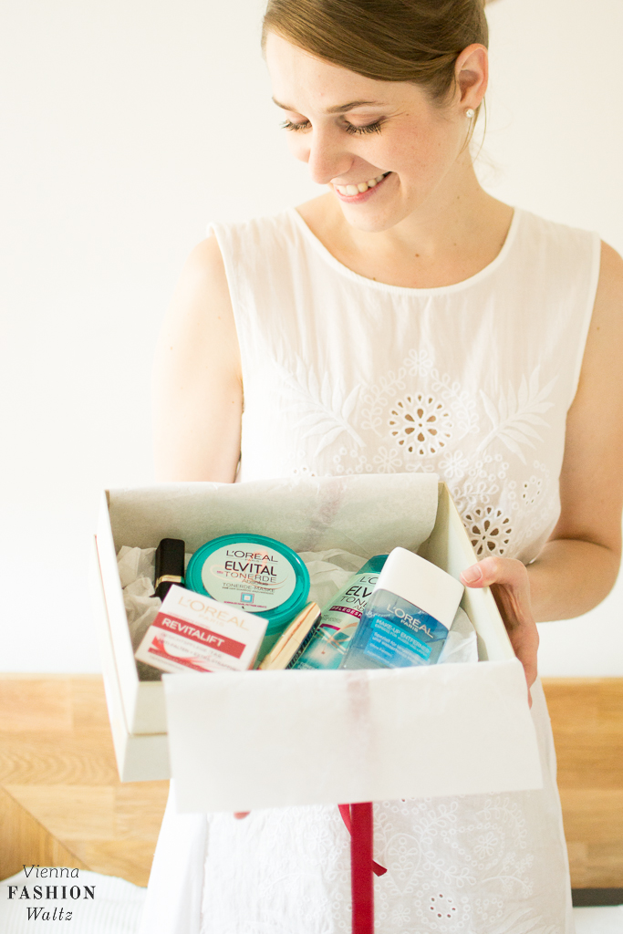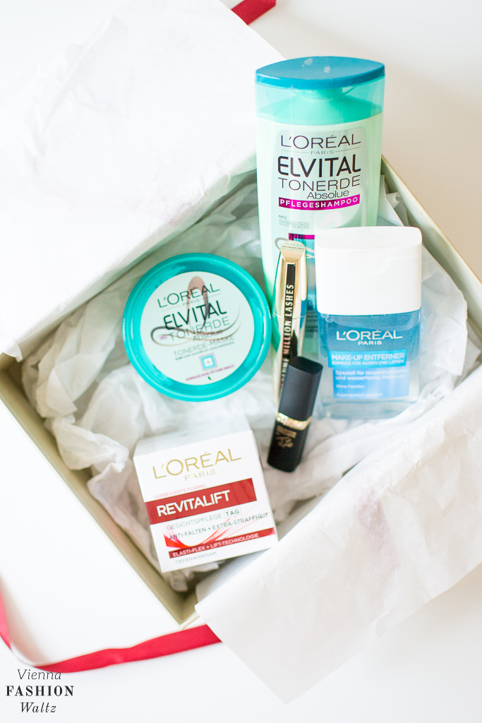 Liebe auf den ersten Blick, ja genau so würde ich es nennen, denn die wunderschöne Schachtel mit ihrem süßen Design hat es mir schon von vorne herein angetan. Deckel ab und Schleife auf … Trommelwirbel … die Spannung steigt! In der Box sind 6 Produkte von L’Oreal enthalten. Mir ist sofort die Wimperntusche Volume Million Lashes ins Auge gestochen, denn ich bin definitiv ein Mascara-Junkie. Passend dazu gibt es auch gleich einen Make-Up Entferner, sowie einen nude-färbigen Lippenstift aus der Color Riche Collection exclusive by J Lo! Eine Tages-Gesichtspflege sorgt tiefenwirksam für einen Straffungseffekt und zwei Elvital Tonerde Haarprodukte noch oben drauf gepackt, kümmern sich um eine schöne Haarpracht. Überzeugt vom Inhalt? Dann drücken wir dir die Daumen, dass du am Dienstag eine von 1.000 Jubiläumsboxen ergattern kannst. Wenn du vorab schon deine Hoffnungen schüren möchtest, dann gleich nach unten scrollen und an unserem Gewinnspiel teilnehmen!