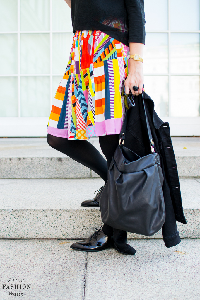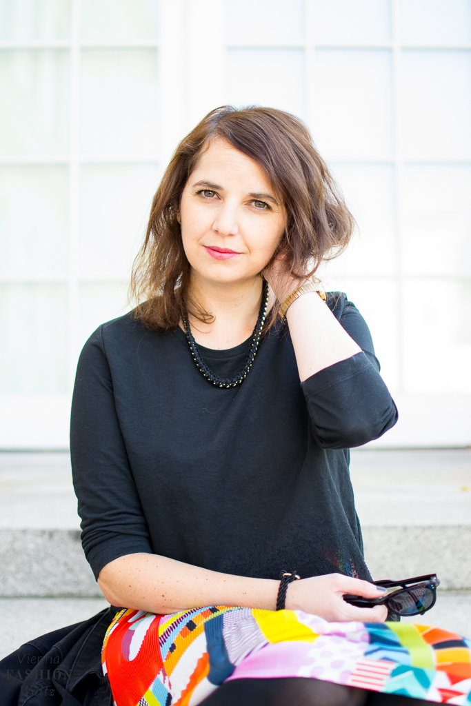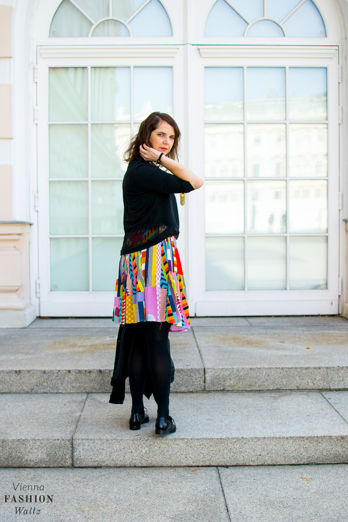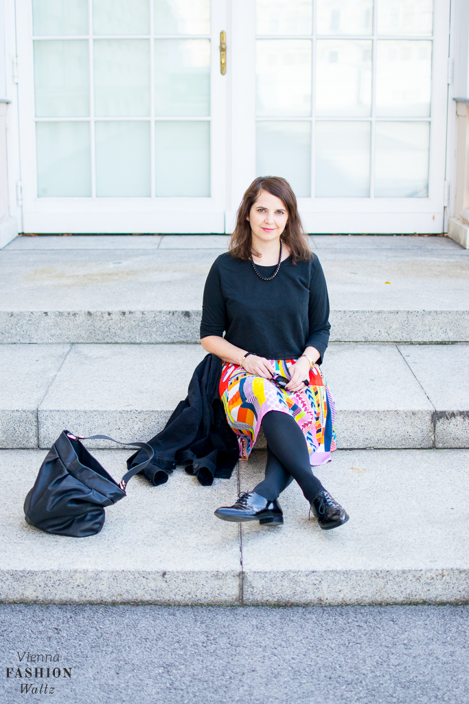 Bei mir fällt die Wahl auf einen bunten Plissee-Rock der mit Schwarz kombiniert ganz schnell Herbst-tauglich gemacht wird.