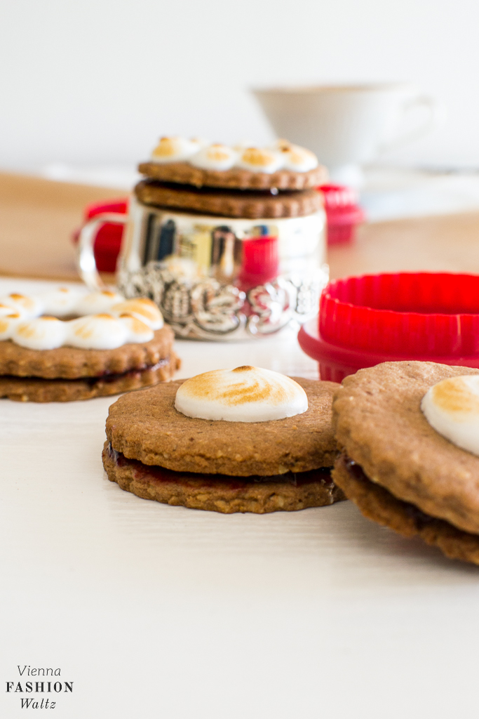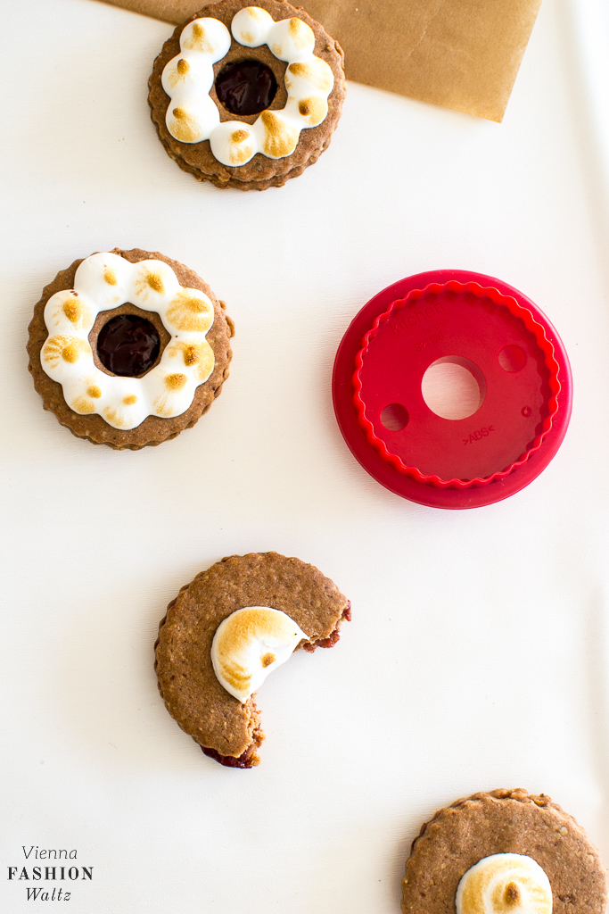 Die Herausforderung bei diesen Keksen war das Baiser. Die optimale Eiklar-Masse, die dann die Form von zuckersüßen, kleinen Tupfen auf den Keksen hat, ist gar nicht so einfach zu machen, wie gedacht. Mega Spaß hatte ich dafür mit dem Bunsenbrenner von meinem Papa, denn das Baiser braucht Farbe und muss ganz vorsichtig karamellisiert werden. Auch wenn ich Linzer Kekse super gerne mag und sie jedes Jahr zu Weihnachten wieder mit dabei sind, aber Abwechslung und ein neuer süßer Genuss schaden nie!