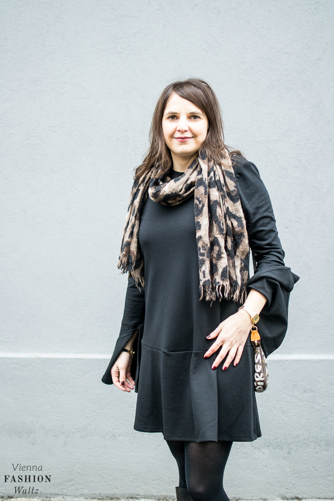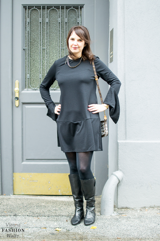 Das kleine Schwarze geht immer. Im Winter mit dicker Wollstrumpfhose und einem warmen langen Wollcardigan oder einfach einem Schal. Schwarz kann man mit jeder anderen Farbe kombinieren. Diesmal habe ich Braun und Gold gewählt, obwohl diese laut Farbberatung mir nicht unbedingt schmeicheln. Das Kleid habe ich von Zara und ist total simpel, aber mit den langen Glockenärmeln, sowie dem Volant am Saum einfach ein Traum. Flache, spitze Stiefel dazu. Die Pochette von Louis Vuitton ist eine meiner Lieblingstaschen und passt eigentlich zu jedem Outfit.