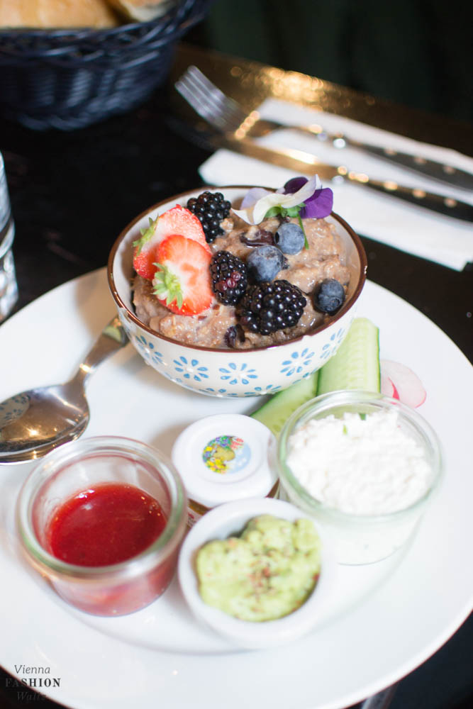 Cottage Cheese mit Schnittlauch, Avocado Dip, Gurkensticks, Radieschen, hausgemachter Marmelade, Bio Butter, Honig, Dinkelvollkornbrot dazu bestellte ich noch den veganen warmen Porridge.