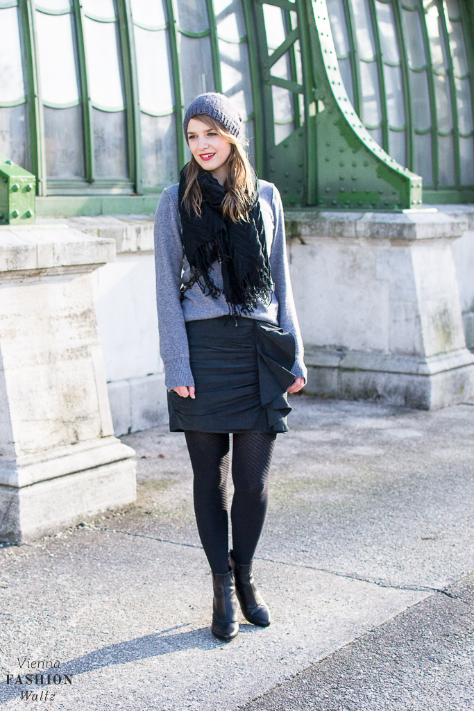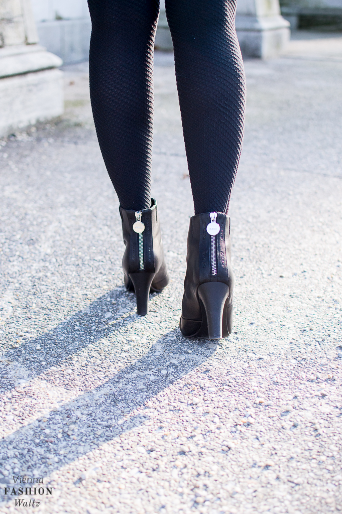 … black tights with everything! Die klassische, schwarze Strumpfhose ist wie ein Chamäleon, denn sie passt immer. Ob festlich, elegant, stylish, cool, cosy oder casual mit schwarz liegst du ganz bestimmt richtig! Bleibt nur die Frage in welcher Ausführung? Matt oder glänzend! Transparent oder blickdicht! Muster oder schlicht! Polyamid, Baumwolle oder Merino! Hört sich nach einem Labyrinth an? Ich sage: „No no no no no“! Das wichtigste ist immer, dass eine Strumpfhose bequem ist, danach überlege ich zu welchem Anlass ich sie brauche. Umso eleganter die Festivität, umso dünner und transparenter darf die Strumpfhose sein. In der Übergangszeit ziehe ich super gerne Kleider und Röcke an, da greife ich schon zu einem etwas stärkerem Material, mit breitem Bund für einen bequemen Tragekomfort. Umso kühler die Temperaturen, desto grober darf das Material meiner Strumpfhose sein – am Besten in einer matten Optik und langer Haltbarkeit. Ist der Winter mal da, dann greife ich zu Strumpfhosen mit einem Anteil an Merinowolle – cosy, casual und schön warm. Da ich einen richtigen Faible für Wolford Strumpfhosen hege, habe ich natürlich nicht nur Klassiker in meinem Repertoire, sondern auch Exemplare mit den unterschiedlichsten Mustern und Strukturen, so wie diese in meinem heutigen Look. Tipps & Tricks: Bevor du das erste Mal in deine neue Strumpfhose schlüpfst, wasche sie zuvor einmal durch, das Gewebe wird es dir mit langer Haltbarkeit danken. Ich habe leider sehr brüchige Fingernägel und das lieben meine Strumpfhosen nicht. Deshalb habe ich mir weiße Kosmetikhandschuhe zugelegt, um die Feinstrumpfhosen nicht schon vor dem ersten Tragen mit Laufmaschen zu zieren. Schmuck und Uhren erst anlegen, wenn du vorsichtig in die Strumpfhose geschlüpft bist. Und nun folgt meine knackig, kurze Wolford-Must-Have-Liste: