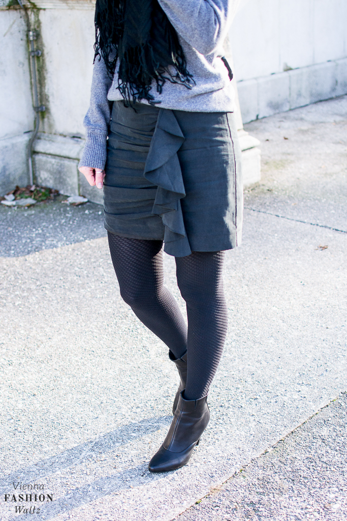 … black tights with everything! Die klassische, schwarze Strumpfhose ist wie ein Chamäleon, denn sie passt immer. Ob festlich, elegant, stylish, cool, cosy oder casual mit schwarz liegst du ganz bestimmt richtig! Bleibt nur die Frage in welcher Ausführung? Matt oder glänzend! Transparent oder blickdicht! Muster oder schlicht! Polyamid, Baumwolle oder Merino! Hört sich nach einem Labyrinth an? Ich sage: „No no no no no“! Das wichtigste ist immer, dass eine Strumpfhose bequem ist, danach überlege ich zu welchem Anlass ich sie brauche. Umso eleganter die Festivität, umso dünner und transparenter darf die Strumpfhose sein. In der Übergangszeit ziehe ich super gerne Kleider und Röcke an, da greife ich schon zu einem etwas stärkerem Material, mit breitem Bund für einen bequemen Tragekomfort. Umso kühler die Temperaturen, desto grober darf das Material meiner Strumpfhose sein – am Besten in einer matten Optik und langer Haltbarkeit. Ist der Winter mal da, dann greife ich zu Strumpfhosen mit einem Anteil an Merinowolle – cosy, casual und schön warm. Da ich einen richtigen Faible für Wolford Strumpfhosen hege, habe ich natürlich nicht nur Klassiker in meinem Repertoire, sondern auch Exemplare mit den unterschiedlichsten Mustern und Strukturen, so wie diese in meinem heutigen Look. Tipps & Tricks: Bevor du das erste Mal in deine neue Strumpfhose schlüpfst, wasche sie zuvor einmal durch, das Gewebe wird es dir mit langer Haltbarkeit danken. Ich habe leider sehr brüchige Fingernägel und das lieben meine Strumpfhosen nicht. Deshalb habe ich mir weiße Kosmetikhandschuhe zugelegt, um die Feinstrumpfhosen nicht schon vor dem ersten Tragen mit Laufmaschen zu zieren. Schmuck und Uhren erst anlegen, wenn du vorsichtig in die Strumpfhose geschlüpft bist. Und nun folgt meine knackig, kurze Wolford-Must-Have-Liste: