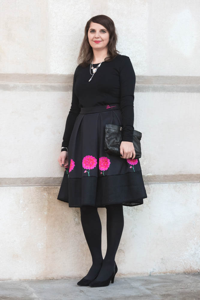 Der Rock ist das Highlight des Outfits daher trage ich dazu ein simples schwarzes Basic-Shirt, eine schwarze Strumpfhose und meine Lieblings-Heels, sowie meine Marc Jacobs Tasche.