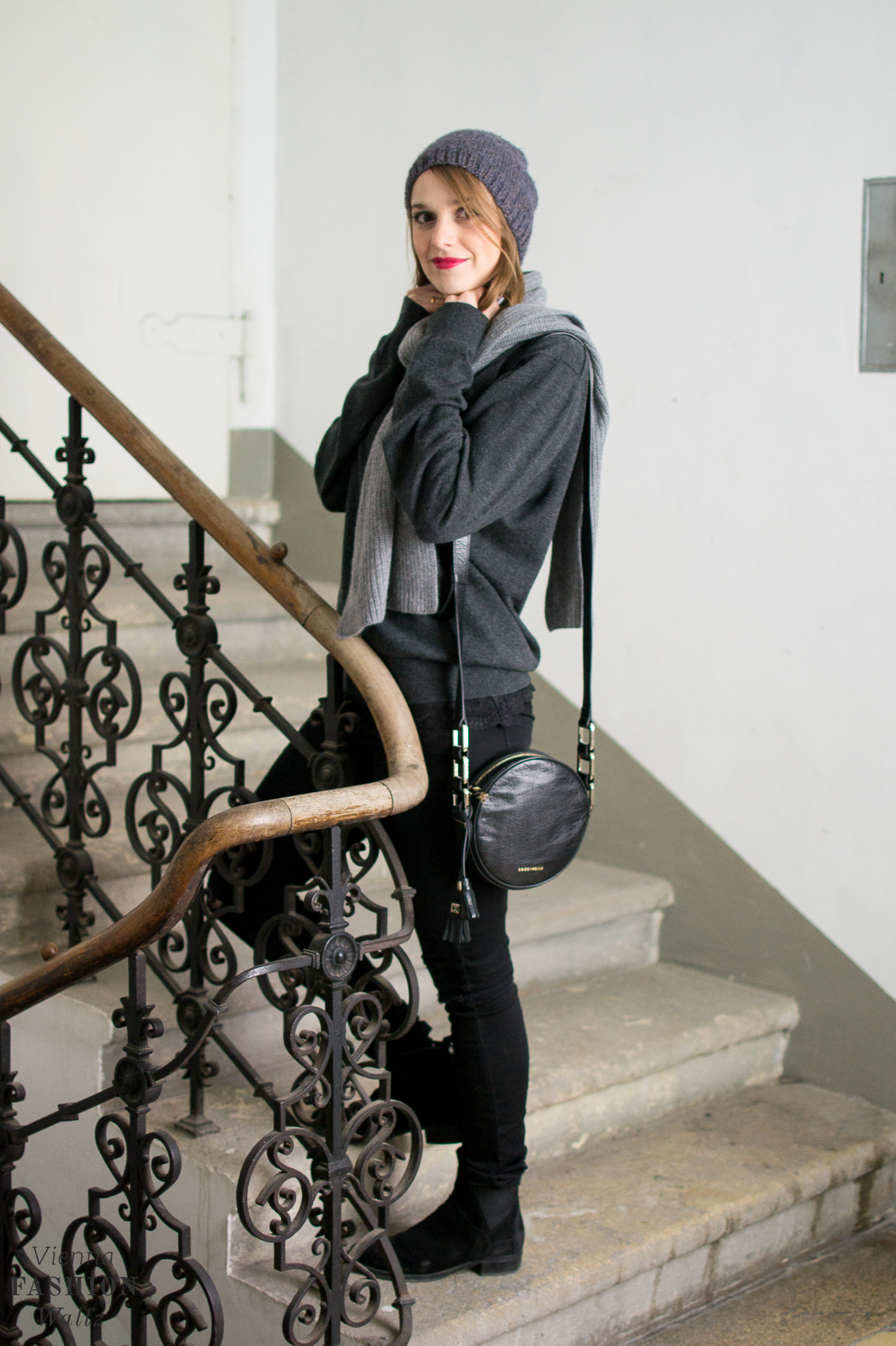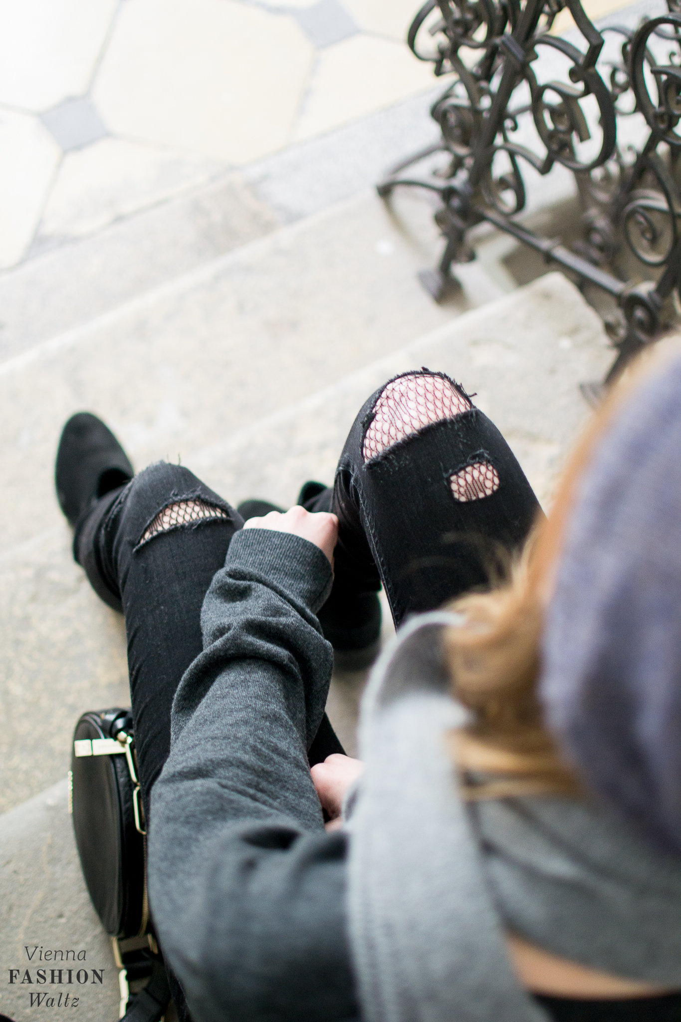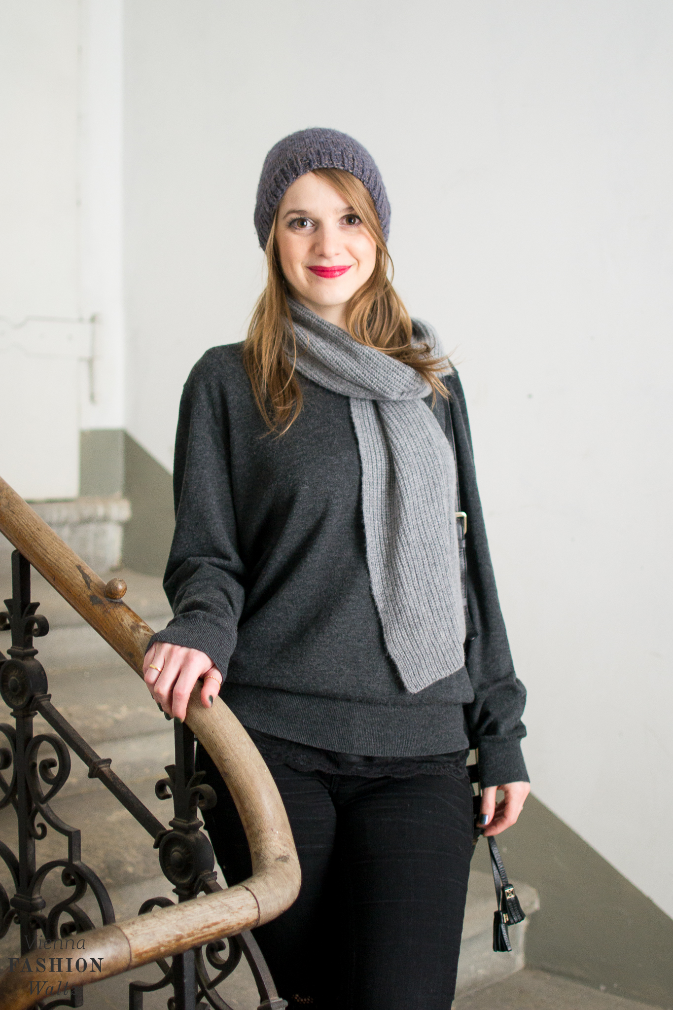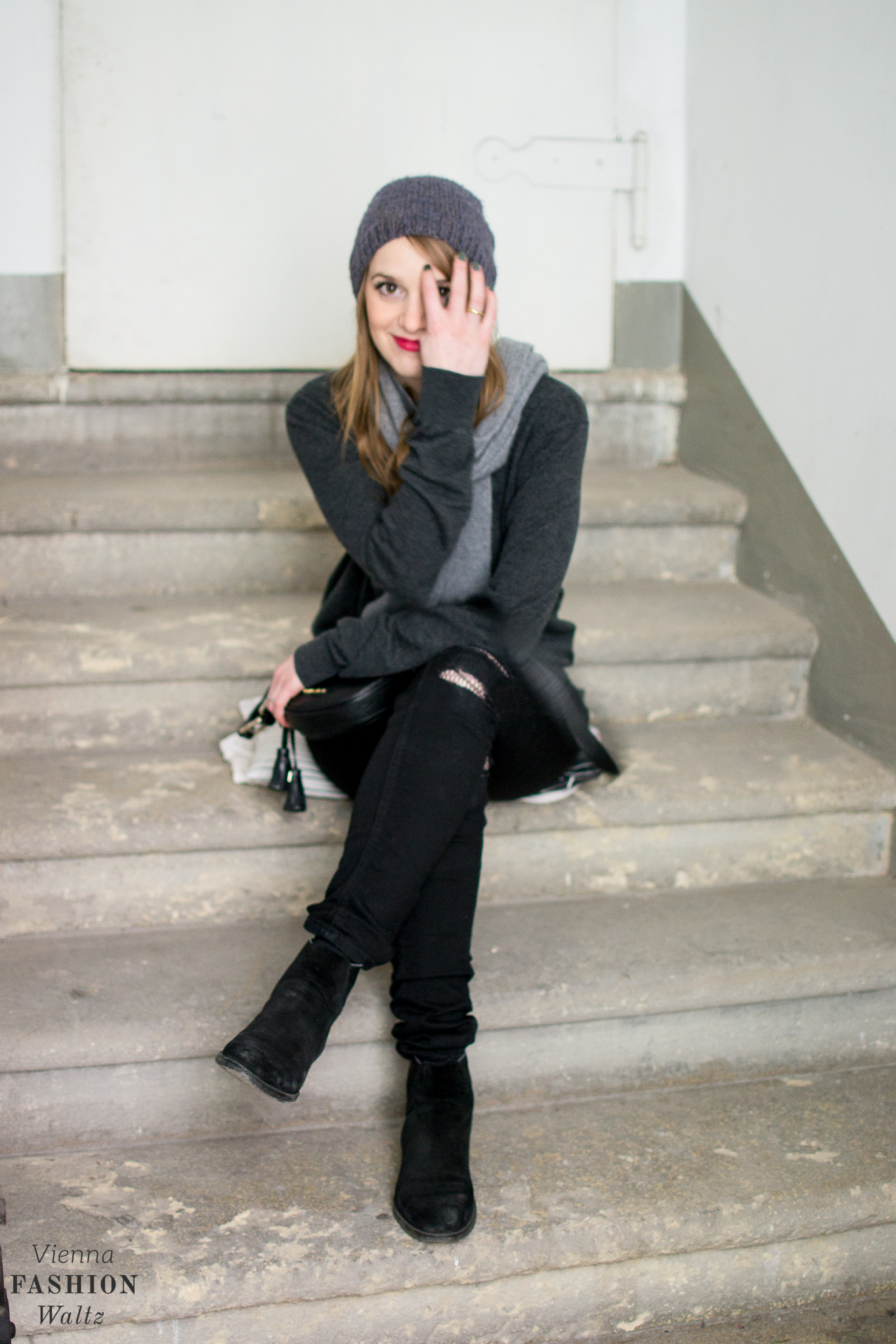 Ich habe mich für den Used-Look entschieden und die Fishnet Tights unter einer zerrissenen Jeans angezogen. Super für den Winter, denn so muss ich nicht frieren. Schlichte Basics in grau & schwarz und das Highlight ist die Netzstrumpfhose. Zur Jeans wollte ich ein Oversized-Teil und daher habe ich im Kasten von meinem Mann gestöbert. Geborgt habe ich mir seinen derzeitigen Lieblingspulli und wider erwarten sitzt das gute Stück bei mir ausgezeichnet. Dazu habe ich noch seinen Cashmere Schal kombiniert. Ich habe mich pudelwohl in seinen Sachen gefühlt. Was er wohl davon hält, wenn ich jetzt öfter seine Kleidung trage?!
